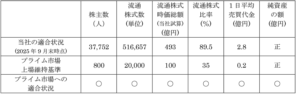 ※当社の適合状況は、当社が2025年9月30日時点で把握している当社の株券等の分布状況等をもとに算出を行ったものです。流通株式時価総額は、2026年3月23日以前3ヶ月間の終値を平均して当社にて算出いたしました。同様に1日平均売買代金は、2025年1月6日から同年9月30日までの9か月間の日毎平均売買高をもとに当社にて算出いたしました。