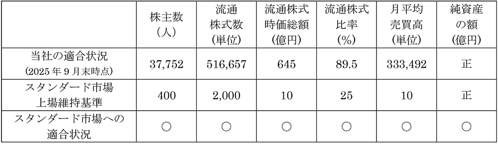 ※スタンダード市場への適合状況につきましては、当社が2025年9月30日時点で把握している当社の株券等の分布状況等をもとに算出を行ったものです。流通株式時価総額は、2026年3月23日以前1ヶ月間の最低株価にて算出いたしました。同様に月平均売買高は、2025年9月30日前6ヶ月間の月平均売買高をもとに当社にて算出いたしました。